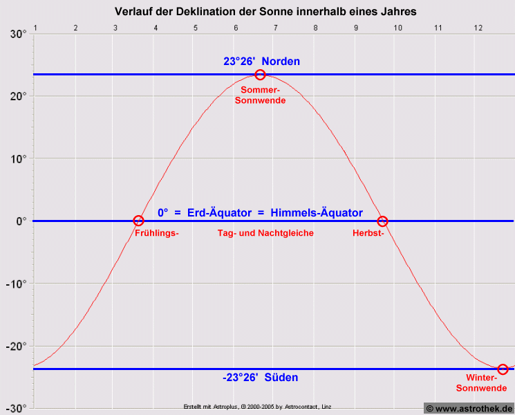 Diesen Sonnenstand kann man in Gradzahlen der Breitengrade ausdrücken, und er wird gemessen als "Deklination".