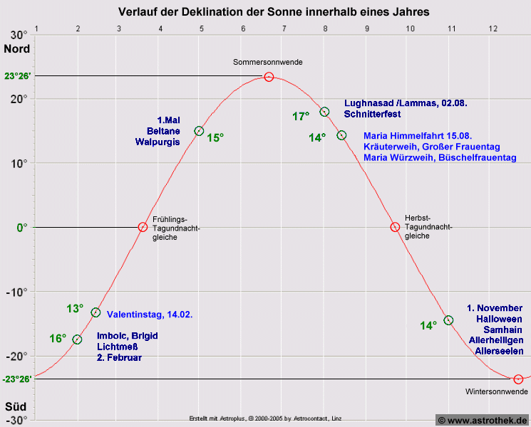 Die Feste, die im allgemeinen am überzeugendsten beschrieben werden, und von deren Datum sich kaum jemand trennen möchte, sind Beltane bzw. der 1. Mai, und Samhain / Halloween / Allerheiligen/Allerseeelen um den 1. November. Beides liegt zwischen 14° und 15° Deklination.