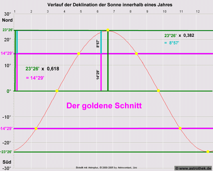 Genau dort, zwischen 14° und 15°, ist der "Goldene Schnitt" zwischen Tagundnachtgleiche (0°) und Sonnenwende (23°26').